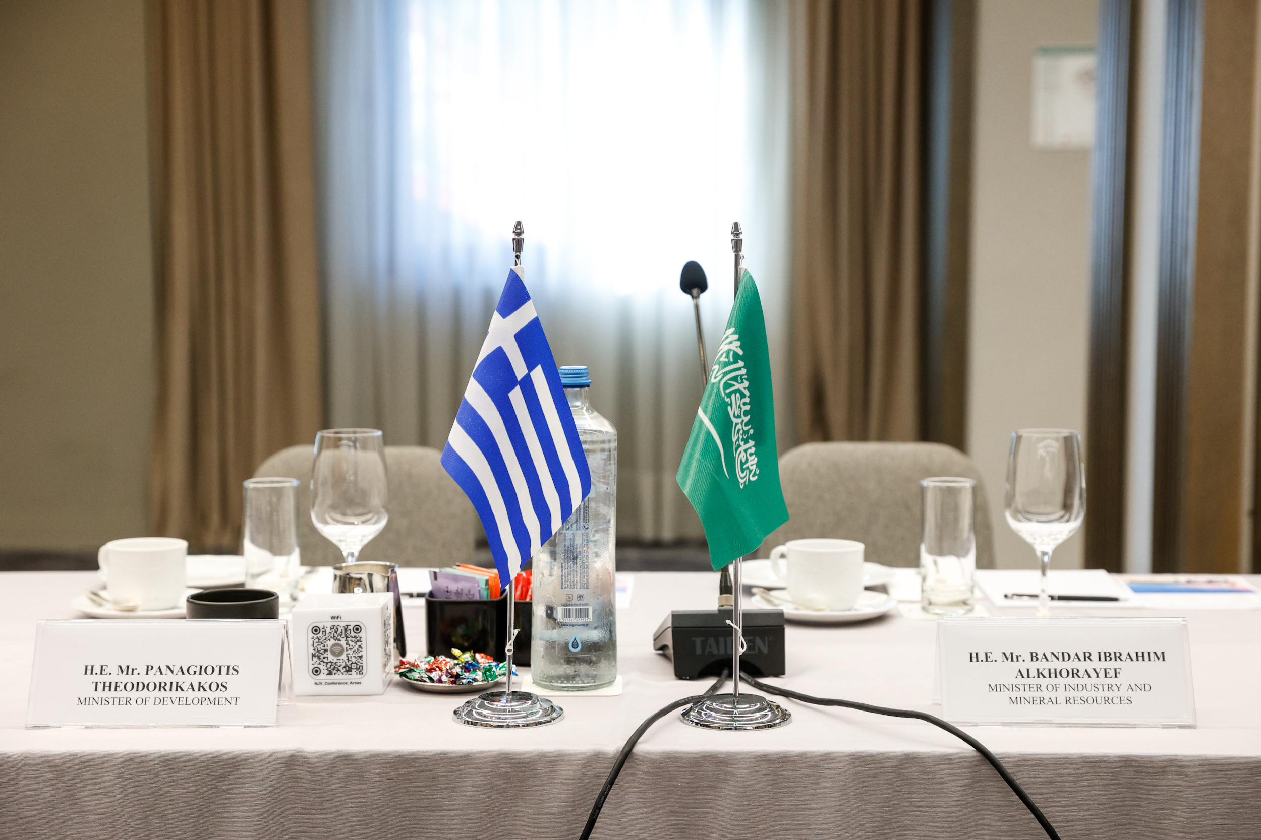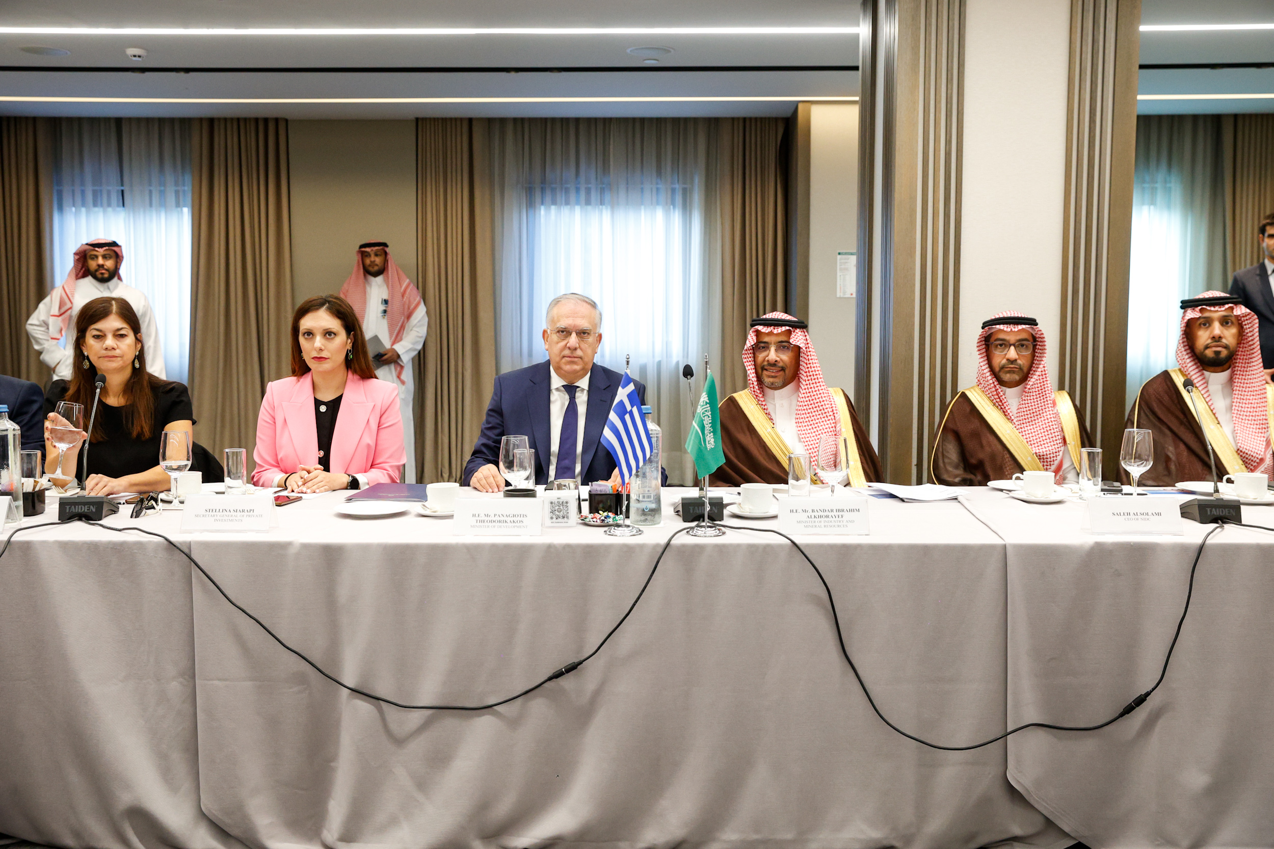 Πρωινό εργασίας, με τη συμμετοχή εκπροσώπων μεγάλων ελληνικών επιχειρήσεων, είχαν ο Υπουργός Ανάπτυξης Τάκης Θεοδωρικάκος και ο Υπουργός Βιομηχανίας και Ορυκτών Πόρων της Σαουδικής Αραβίας Bandar Ibrahim Alkhorayef, επιβεβαιώνοντας την κοινή βούληση για περαιτέρω εμβάθυνση των στρατηγικών σχέσεων Ελλάδας – Σαουδικής Αραβίας. Στη συνάντηση συμμετείχαν επίσης η Γ.Γ. Ιδιωτικών Επενδύσεων, Στελλίνα Σιαράπη και ο Γ.Γ. Βιομηχανίας, Λευτέρης Κρητικός.