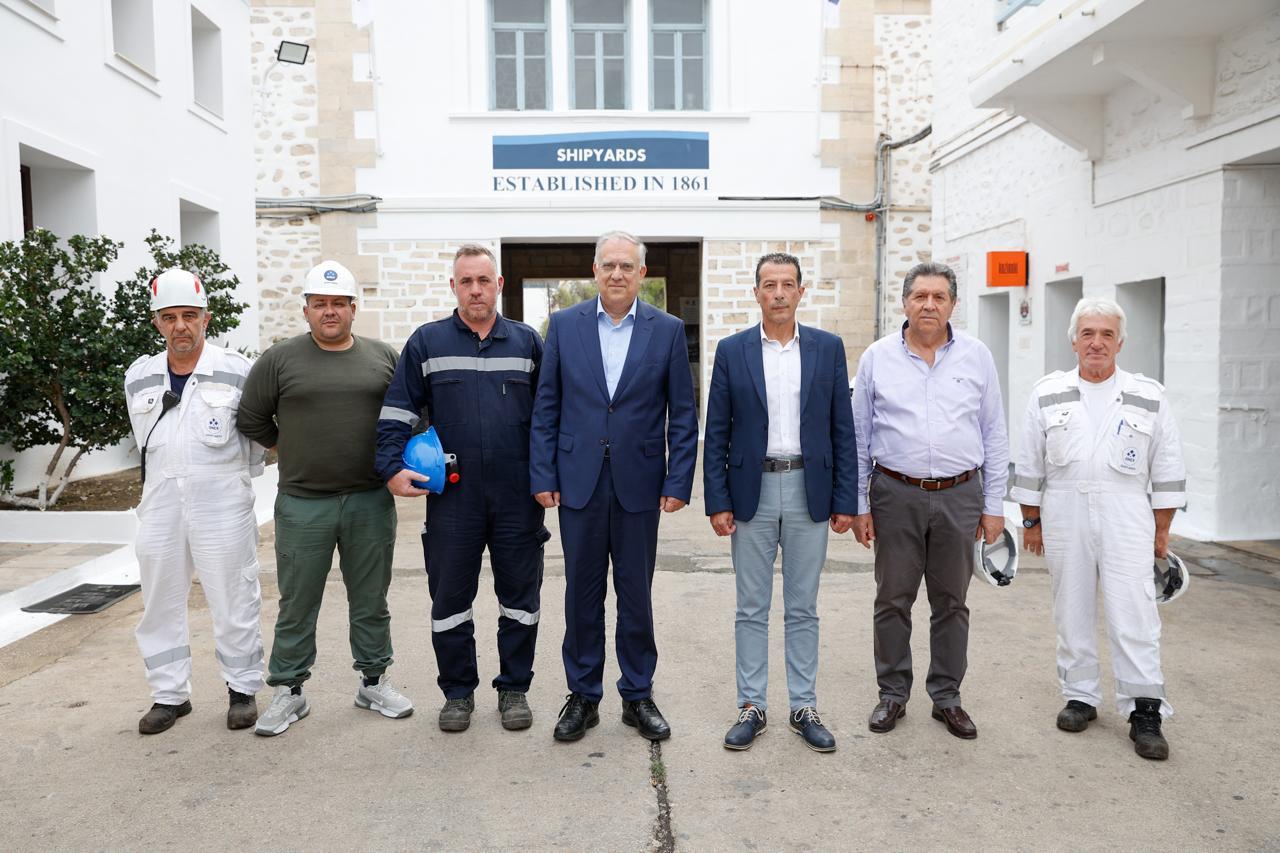 Στη συνέχεια, ο Υπουργός Ανάπτυξης επισκέφθηκε τα Ναυπηγεία Σύρου της ΟΝΕΧ, όπου τον υποδέχθηκε ο Γενικός Διευθυντής Γιάννης Βαμβακούσης. Ξεναγήθηκε στις εγκαταστάσεις, συνομίλησε με τους εργαζομένους και ενημερώθηκε για το πρόγραμμα πλήρους αναβάθμισης των εγκαταστάσεων των ναυπηγείων, το οποίο βρίσκεται σε εξέλιξη και συμβάλλει καθοριστικά στον εκσυγχρονισμό και την ενίσχυση της ανταγωνιστικότητάς τους.