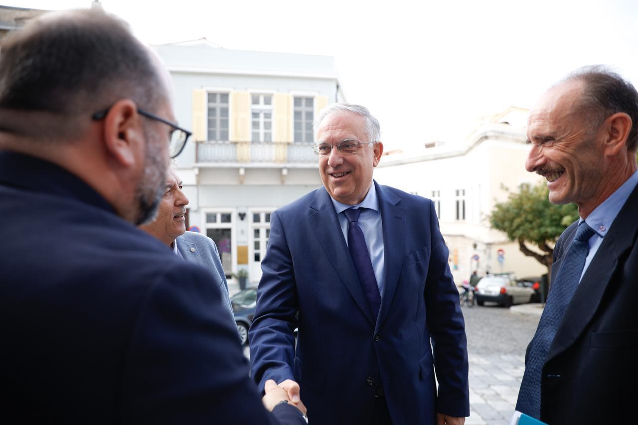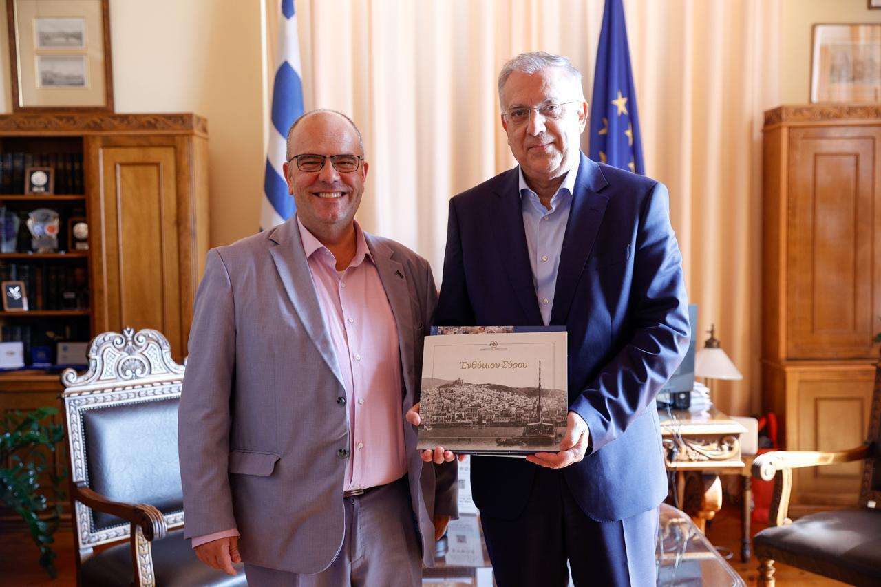 Στο πλαίσιο της επίσκεψής του στη Σύρο, ο Υπουργός Ανάπτυξης επισκέφθηκε επίσης τη Δ.Ε.Ε.Π. Κυκλάδων της Νέας Δημοκρατίας, όπου συνομίλησε με στελέχη και μέλη της οργάνωσης για ζητήματα που αφορούν την ανάπτυξη της τοπικής οικονομίας και της καθημερινότητας των πολιτών. Στη συνέχεια, επισκέφτηκε στο Δημαρχείο Σύρου, όπου συναντήθηκε με τον Δήμαρχο Αλέξη Αθανασίου. Κατά τη συνάντηση συζήτησαν για τα έργα και τις πρωτοβουλίες που υλοποιούνται στο νησί, αλλά και για τις προοπτικές περαιτέρω στήριξης της νησιωτικής επιχειρηματικότητας.